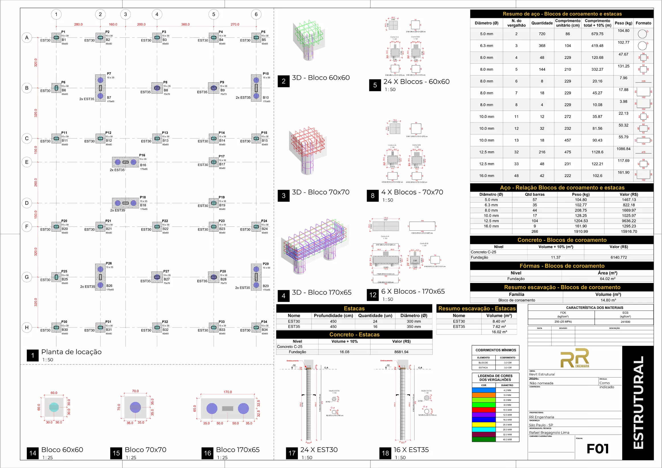 Blocos sobre estacas, tubulões, armaduras e detalhamento completo de um projeto com fundações profundas.