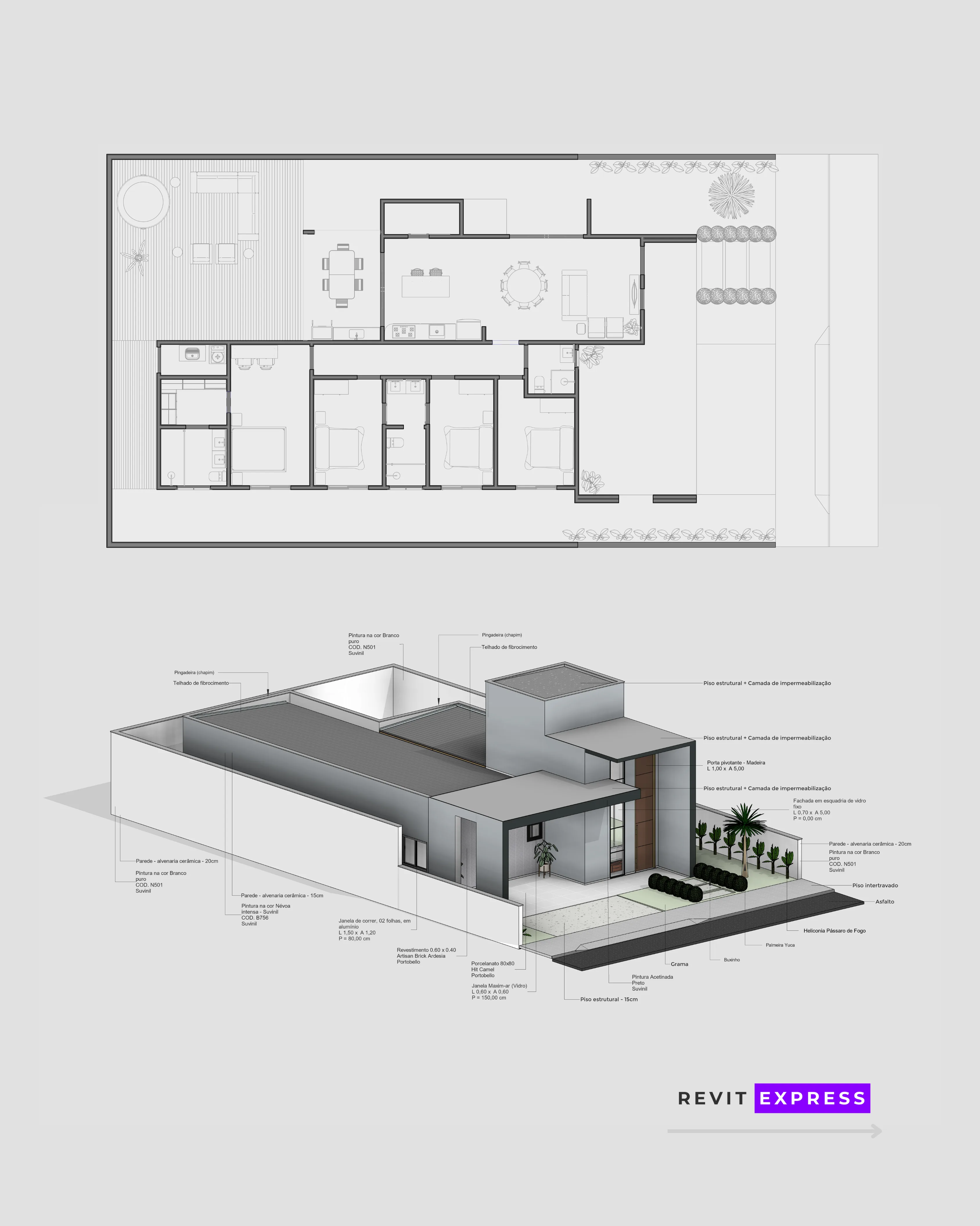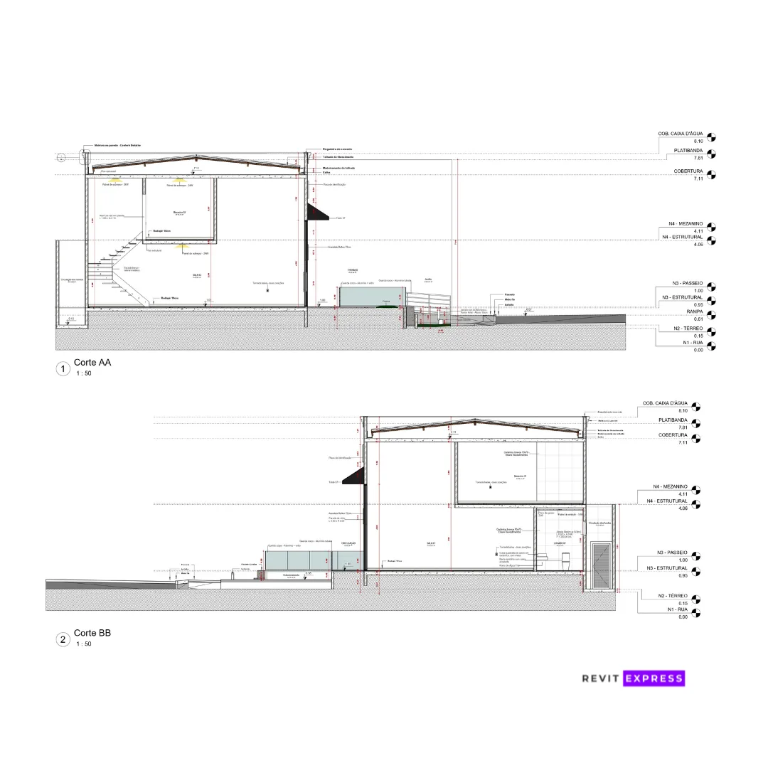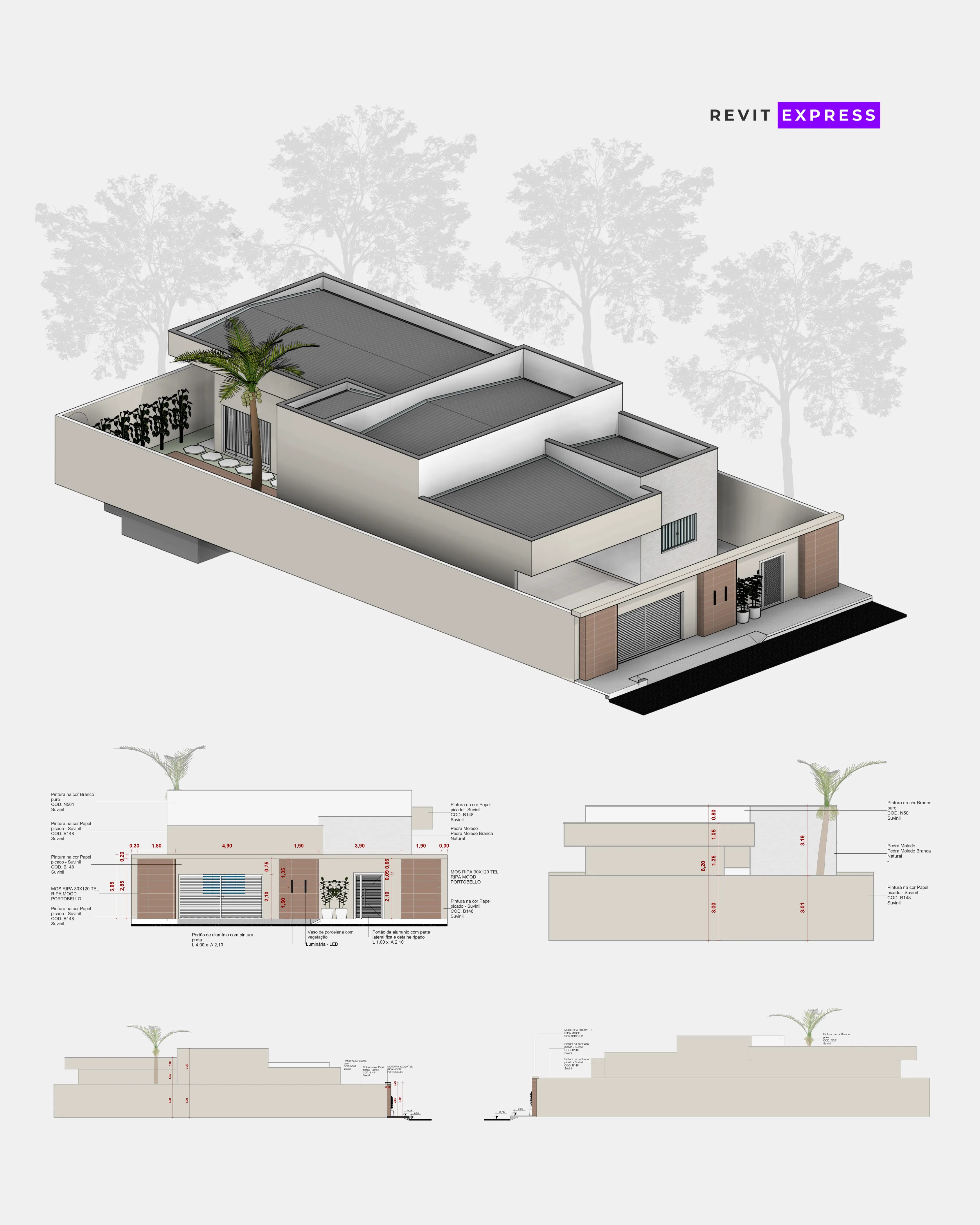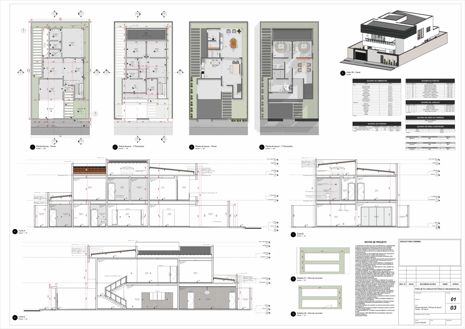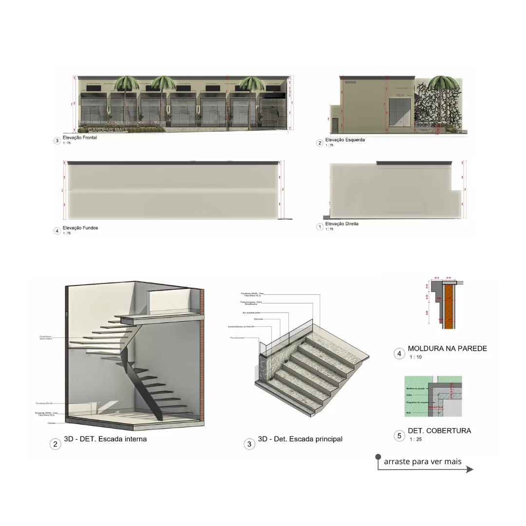 Modelagem completa do piso à cobertura + projeto executivo com todas as plantas, cortes e elevações no mesmo nível que escritórios entregam no mercado.